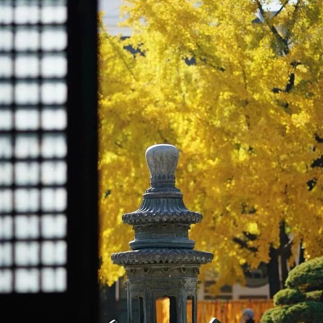 在繁华都市一隅,真如寺内呈现着截然不同的静谧与灿烂。树龄已逾650年、编号0067的古银杏正披覆一身灿烂的金黄,迎来最佳观赏期。它高13.2米,树冠舒展达11米,与身旁屹立七百余年的上海唯一元代木构大殿静默相对。