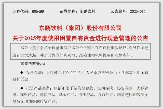 同时,作为龙头企业,东鹏饮料拥有极强的“造血”能力和充沛的现金流。截至2024年底,东鹏饮料账上的现金类资产总额达到142.22亿元,其中货币资金56.53亿元、交易性金融资产48.97亿元、债权投资36.72亿元;2024年经营活动产生的现金流量净额达到57.89亿元。东鹏饮料甚至在2025年3月公告称,计划使用不超过110亿元的闲置资金进行低风险理财。