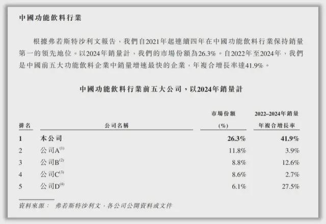 东鹏特饮无疑是成功的,根据招股书,东鹏饮料在中国功能饮料行业前五大公司中,市场份额达26.3%,位列第一,2022年到2024年其销量年复合增长率达41.9%。2024年,其能量饮料销量达308万吨,同比增长29.1%。