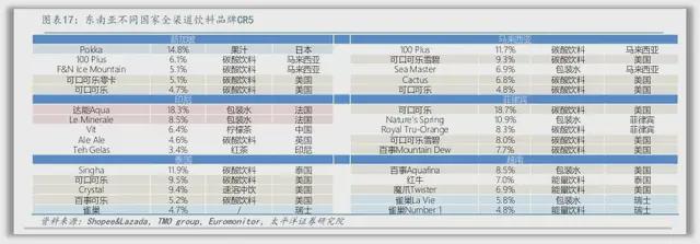 根据太平洋证券研报,东南亚各国主要饮料品类以碳酸饮料、包装水为主,而印尼市场则是即饮茶占比较大。同时,东南亚各国饮料龙头多为外来品牌,全球品牌占据市场主要份额,跨国饮料公司如可口可乐、百事、雀巢成为各国的饮料主品牌。